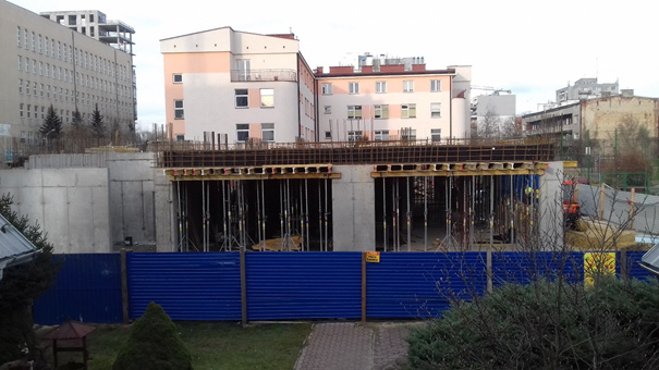 Na posesji przy ul. Teresińskiej 9 w Warszawie w dalszym ciągu trwają prace przy budowie nowego budynku przedszkola.