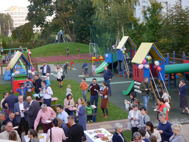 Ostatnia część tej wspaniałej uroczystości odbywała się na placu na placu zabaw i terenie przylegającym do przedszkola. Na zaproszonych gości czekał ciepły posiłek i przekąski, a na dzieci czekała wspaniała zabawa i loteria fantowa przygotowana przez rodziców i nauczycieli. Rodzice i zaproszeni goście mogli obejrzeć i nabyć prace artystyczne dzieci umieszczone w Galerii Przedszkolaków czyli na ogrodzeniu nowego przedszkola, płytki z bajkami naszych rodziców, przygotowywanych z okazji Dnia Dziecka oraz torby z myślami Eleonory Motylowskiej założycielki Zgromadzenia Sług Jezusa i poznać Jej krótki życiorys przedstawiony w wierszach Marii Szulikowskiej. To właśnie na Teresińskiej, Eleonora Motylowska rozpoczęła pracę z dziećmi w 1918 r, przyjmując sieroty z repatriacji. Rozpoczęte dzieło trwa do dzisiaj w postaci naszego przedszkola i szkoły podstawowej.